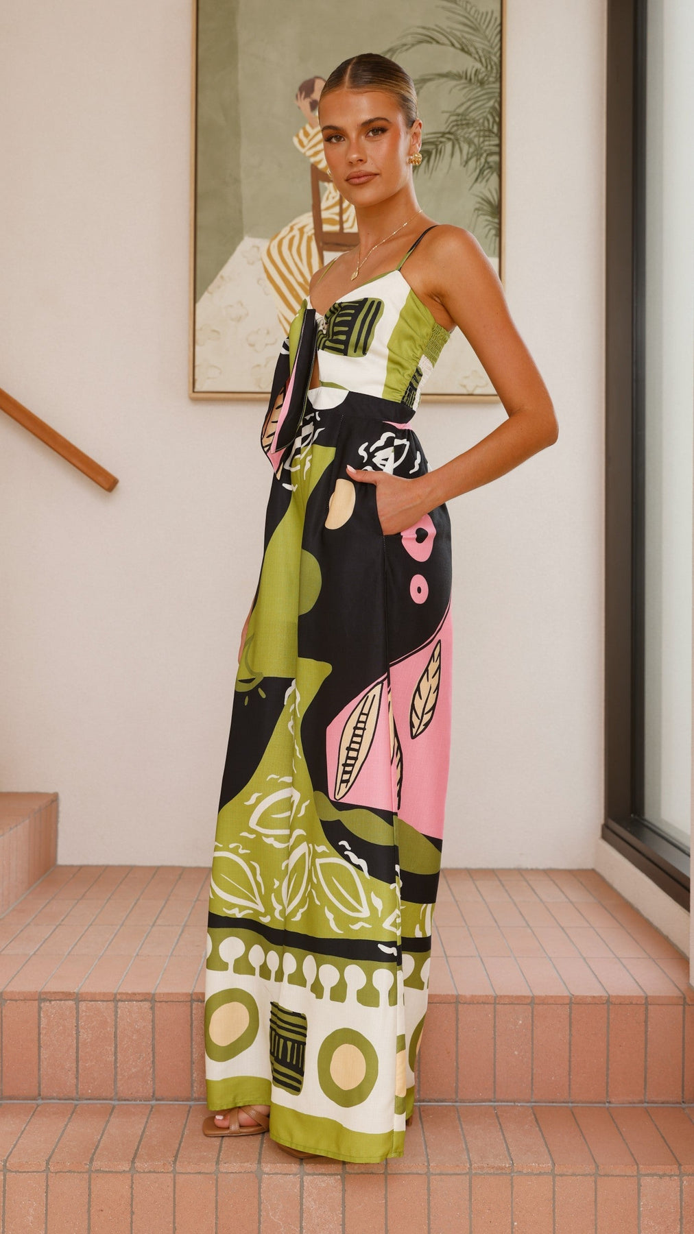 Bold, Beautiful, and Effortlessly Chic. Elevate your wardrobe with the Gaia Print Jumpsuit, a stunning piece that combines vibrant patterns with a flowy silhouette, perfect for sunny days and stylish getaways.