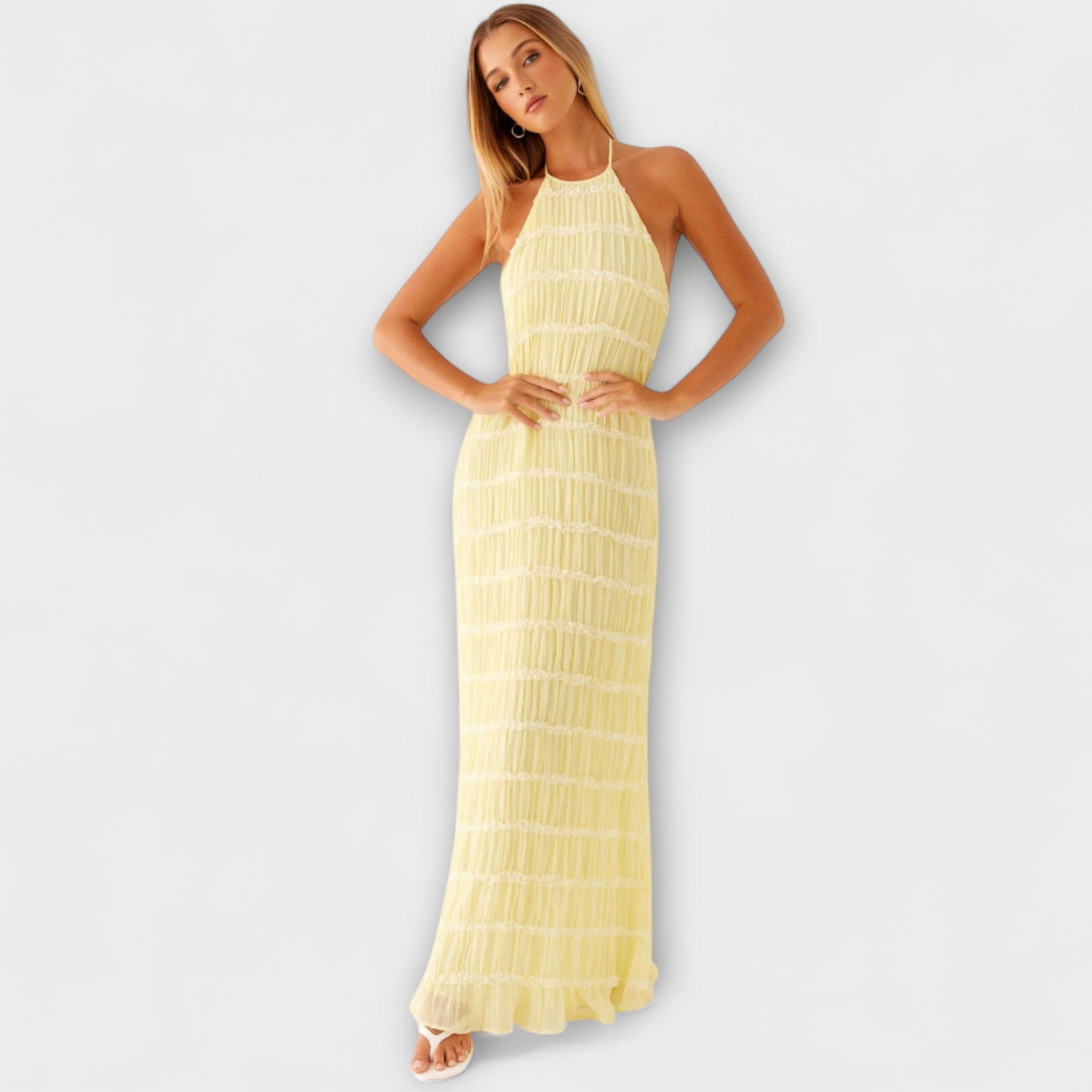 Introducing the Adeline Halter Neck Dress — where effortless elegance meets unmatched comfort. Perfect for sunny beach strolls, festive dinners, or as a glamorous wedding guest look.