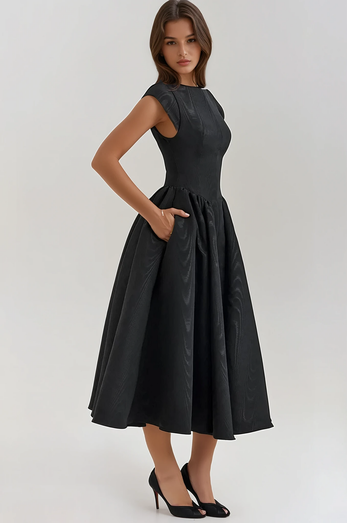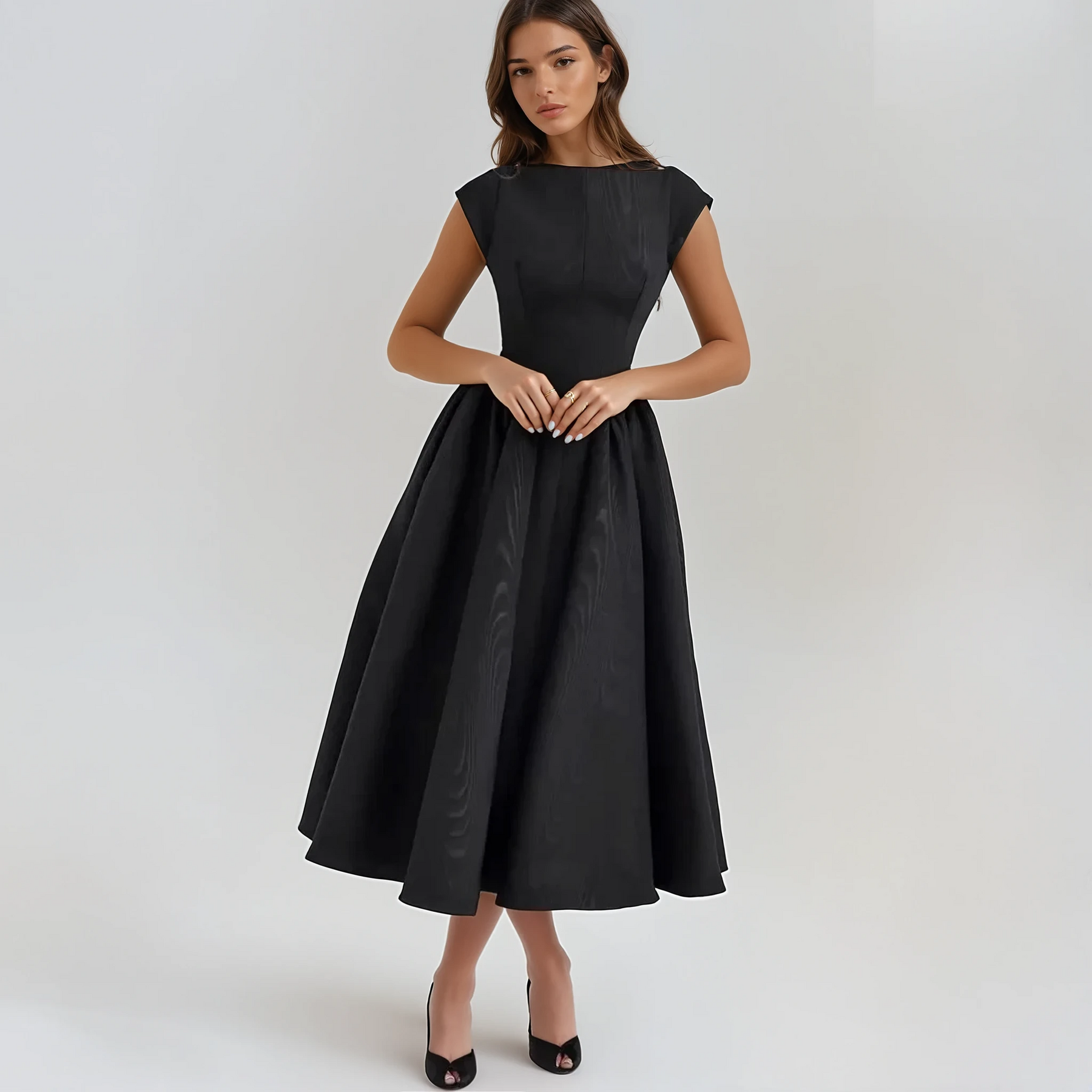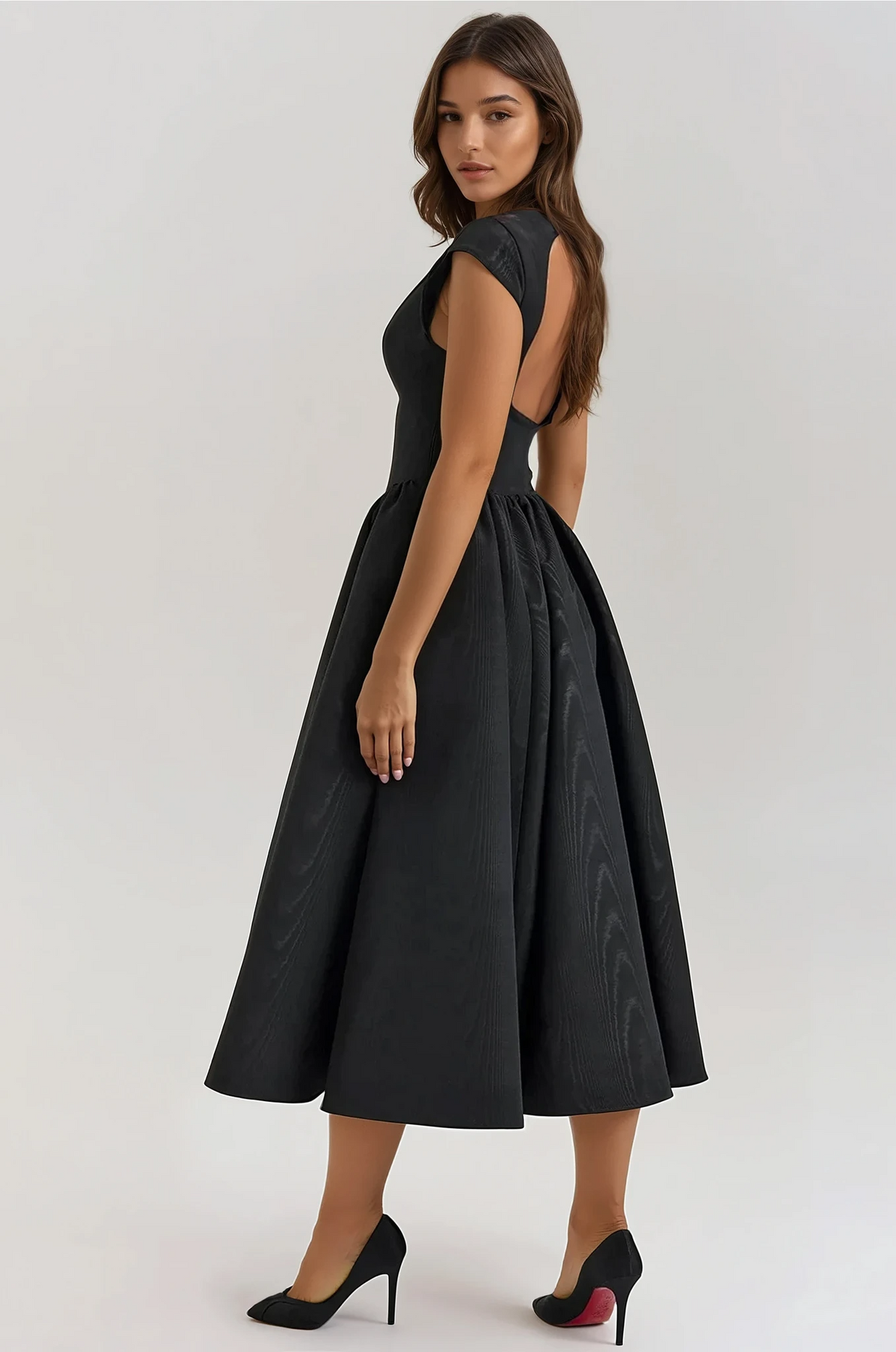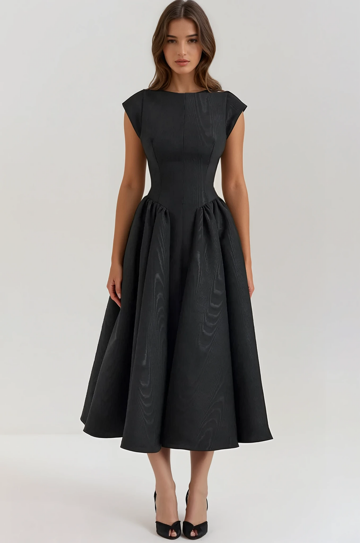 Crafted from sumptuous moiré satin, the Evangeline features a flattering boat neckline and elegant cap sleeves. The sculpted bodice cinches at the waist, flowing into a voluminous, tea-length skirt that exudes exquisite fullness. The unexpected open-back detail adds a sultry twist to this timeless silhouette.