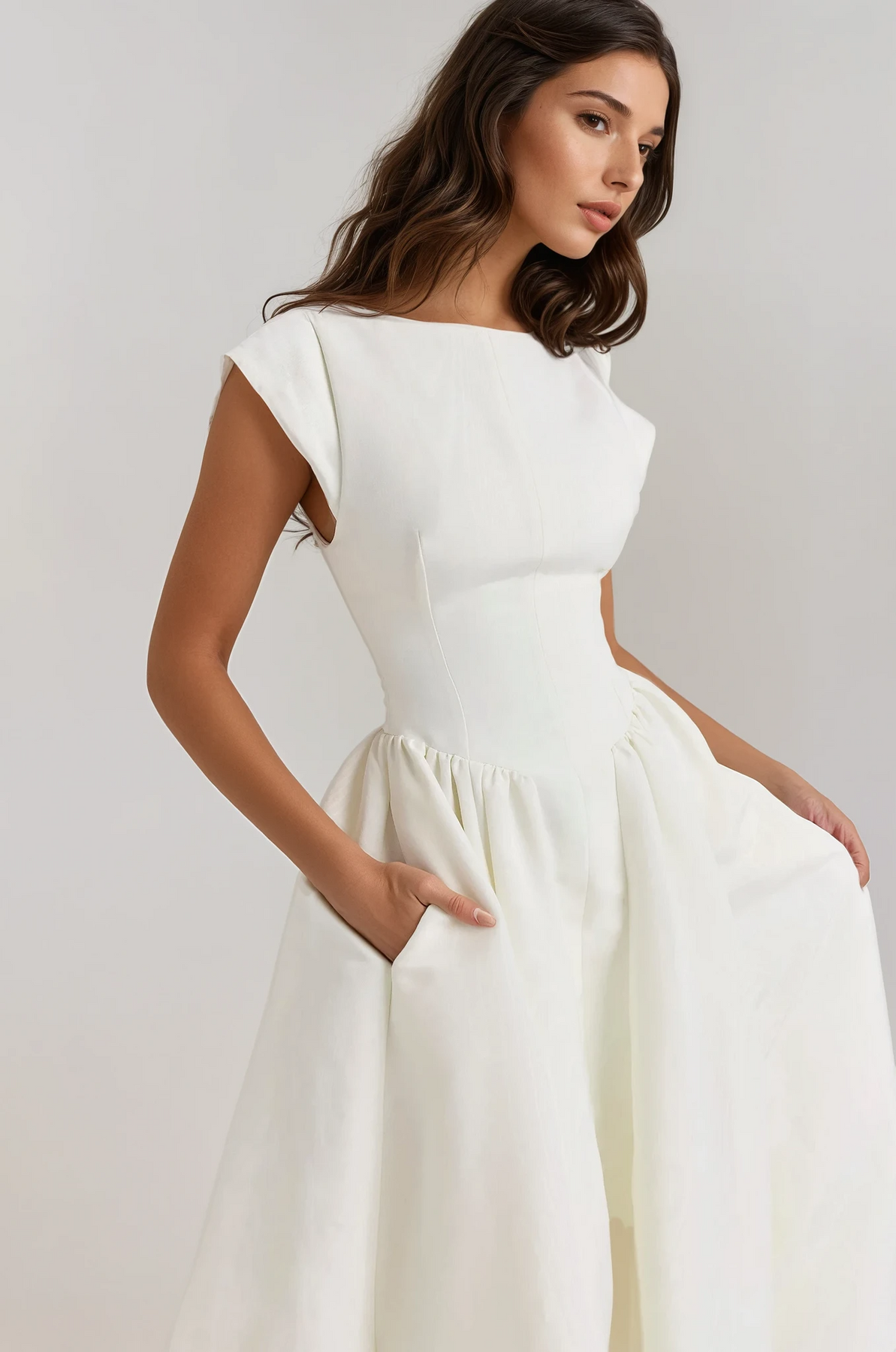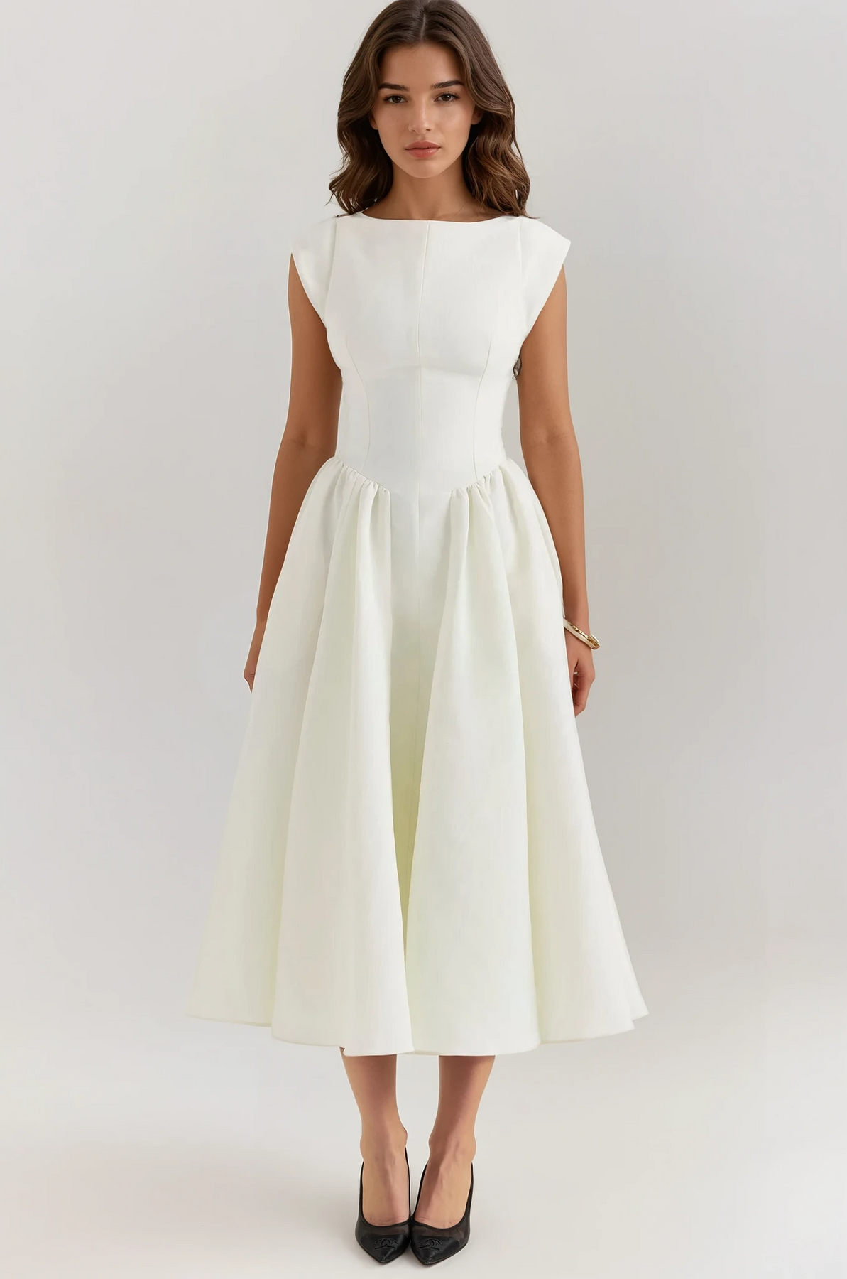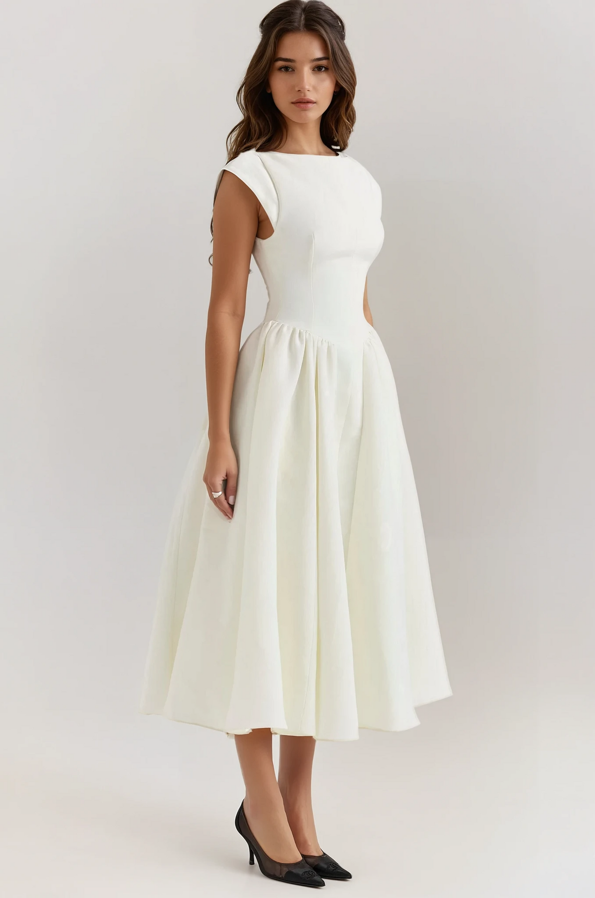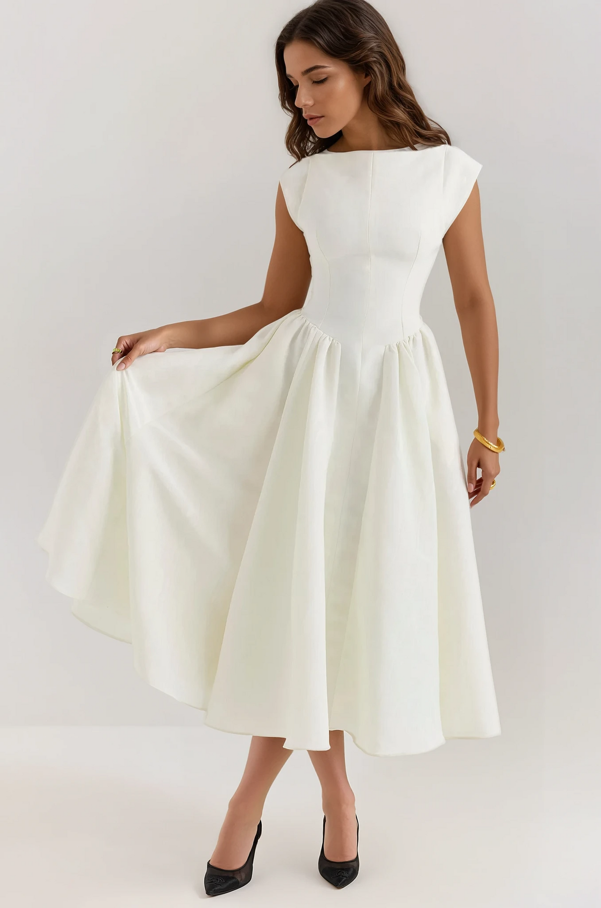 With its voluminous A-line midi skirt and structured fabric that boasts a subtle sheen, the Evangeline is not just a dress; it’s a statement. Make it a staple in your wardrobe and embrace the elegance it brings to every special moment.