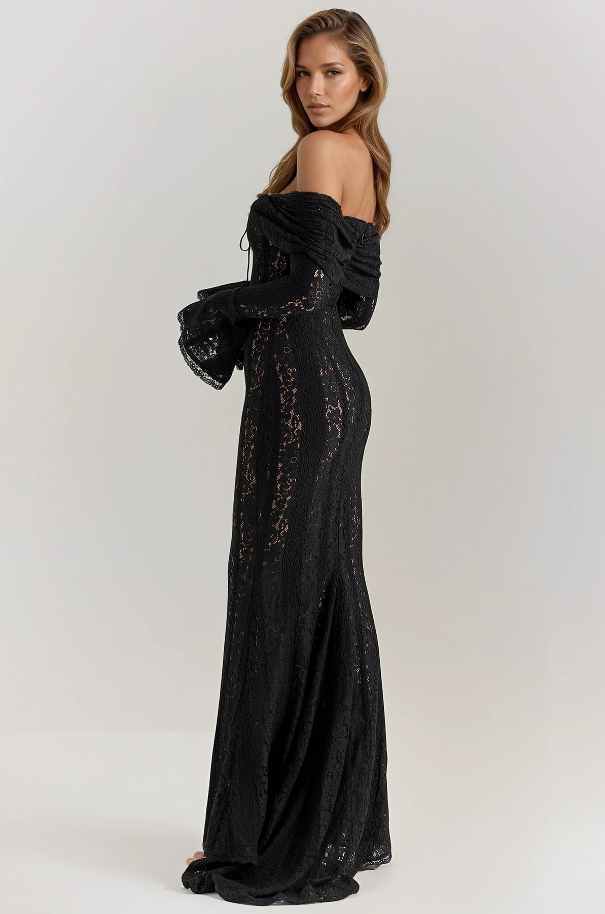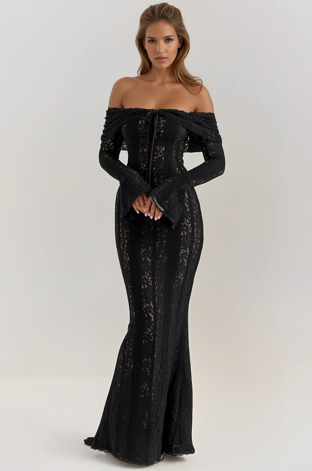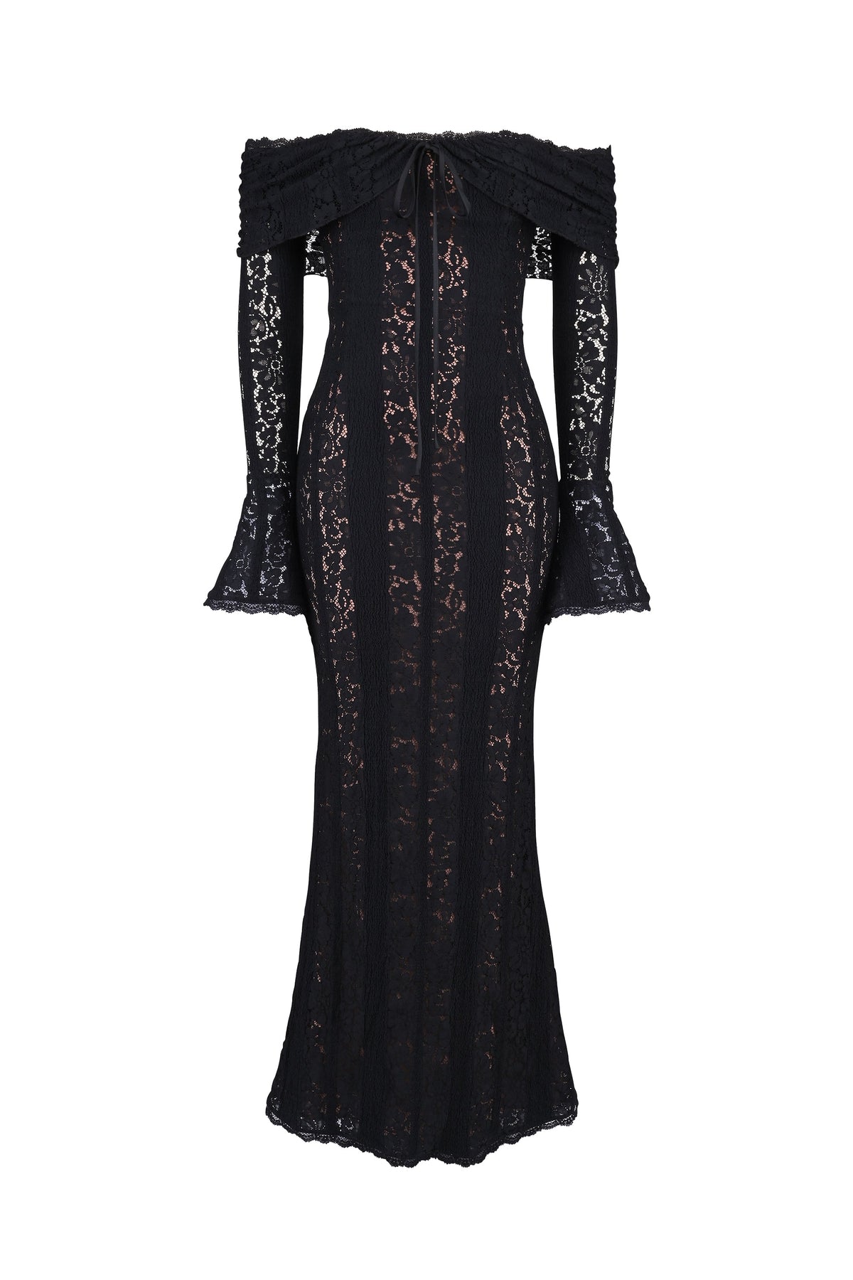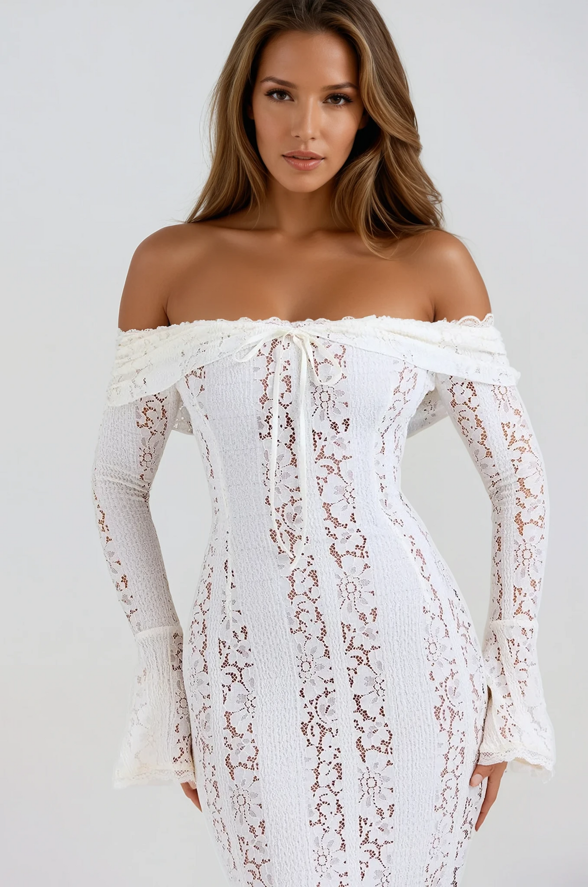 Crafted from delicate crochet-style lace, this floor-length gown hugs your figure while offering a soft, ethereal feel. The off-the-shoulder neckline beautifully frames your décolletage, complemented by flared sleeves and a subtle front tie for a touch of whimsical femininity.