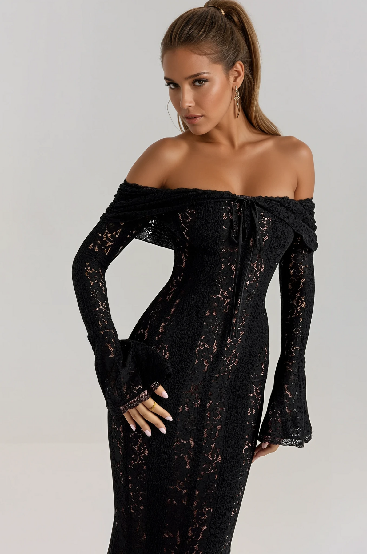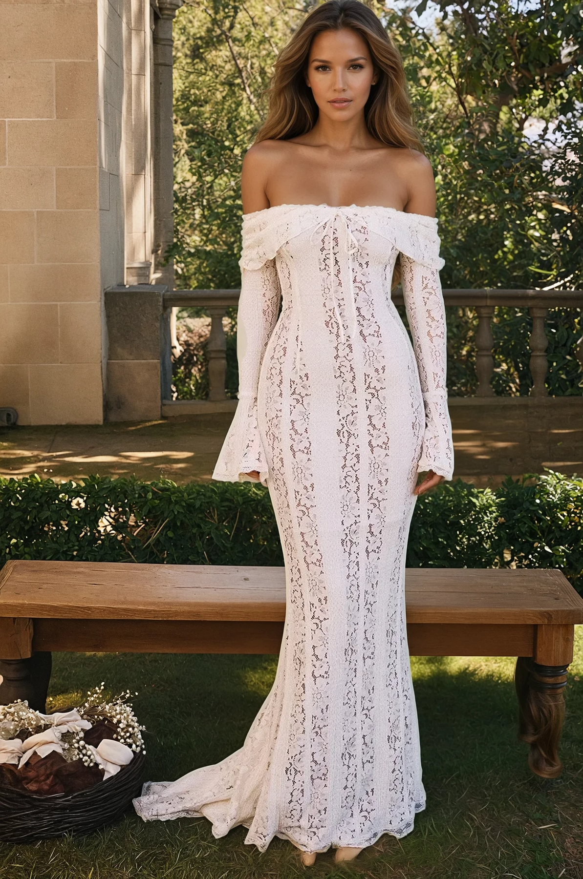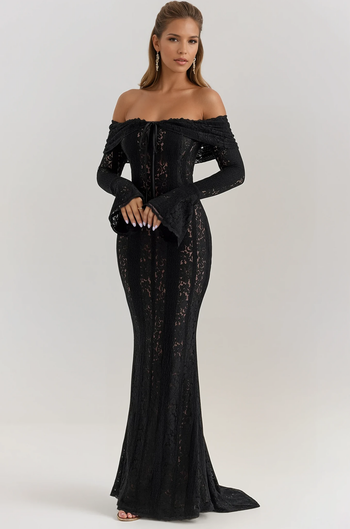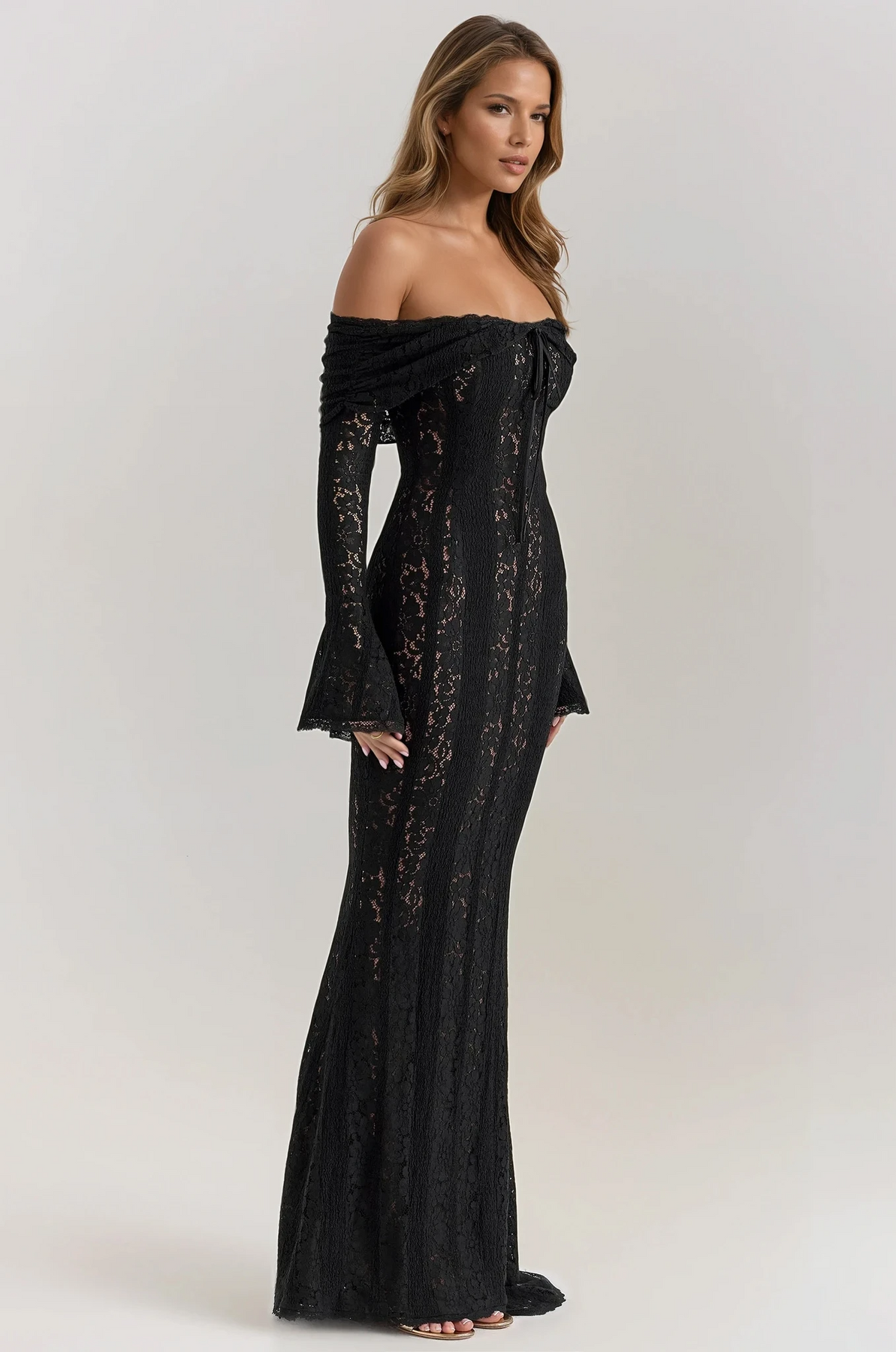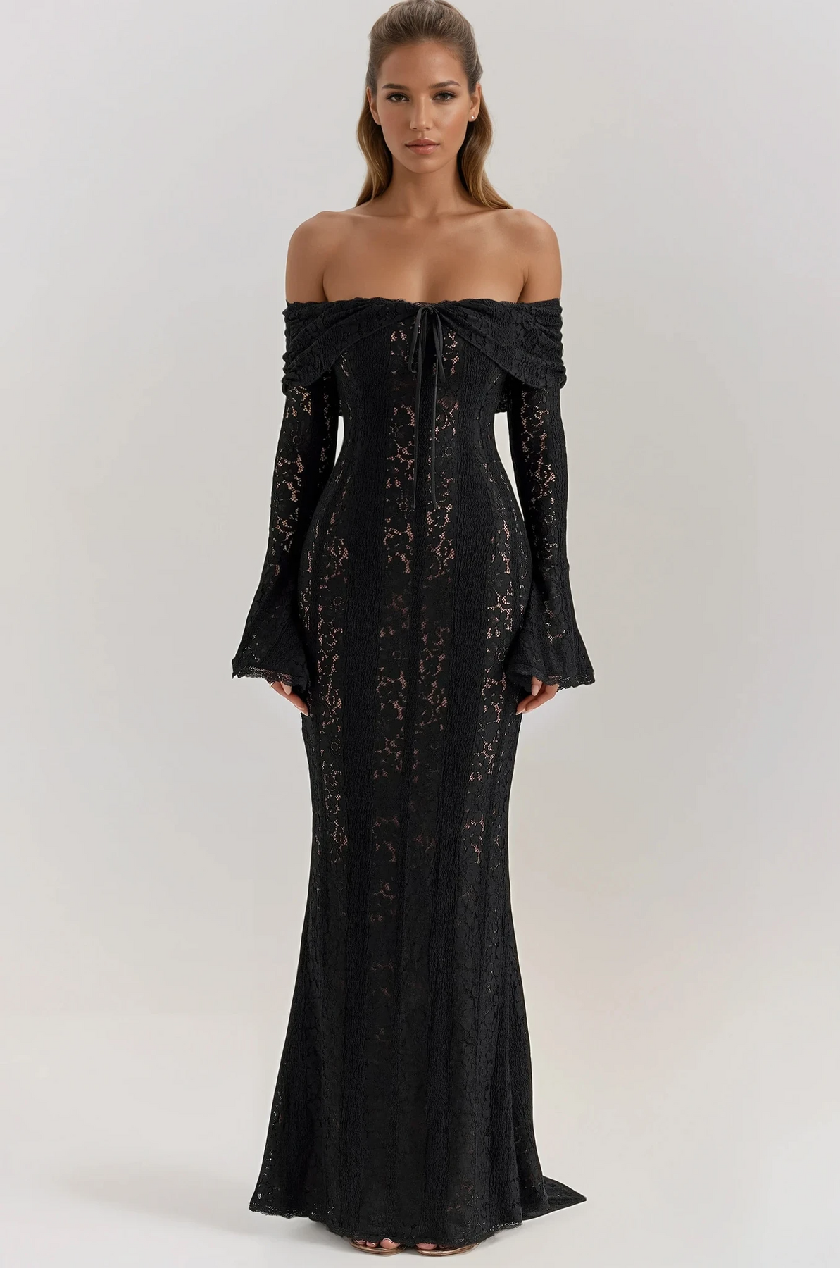 Crafted from delicate crochet-style lace, this floor-length gown hugs your figure while offering a soft, ethereal feel. The off-the-shoulder neckline beautifully frames your décolletage, complemented by flared sleeves and a subtle front tie for a touch of whimsical femininity.