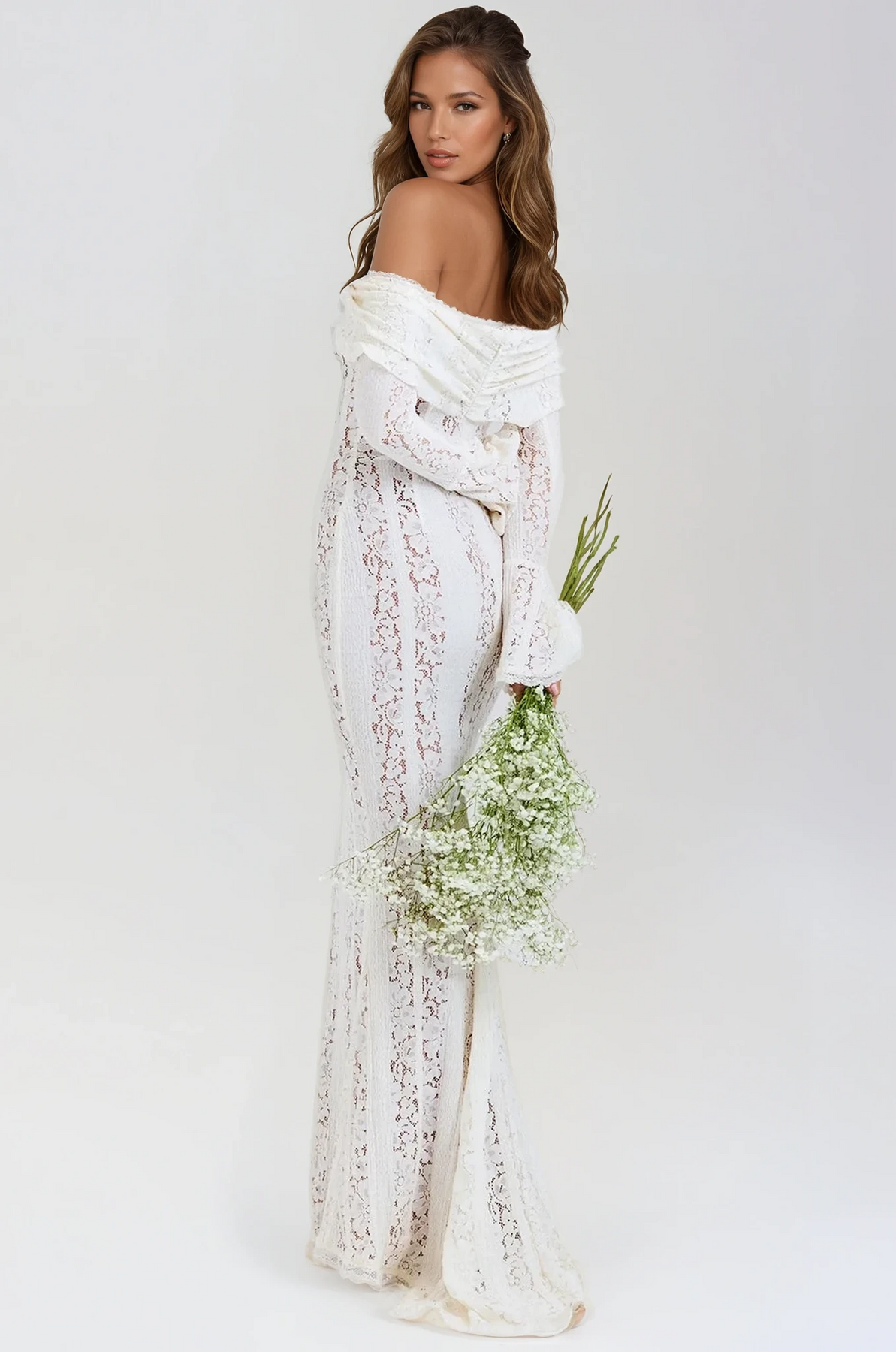 Step into effortless romance with the Celeste Off-Shoulder Lace Gown—where dreamy lace meets timeless elegance.