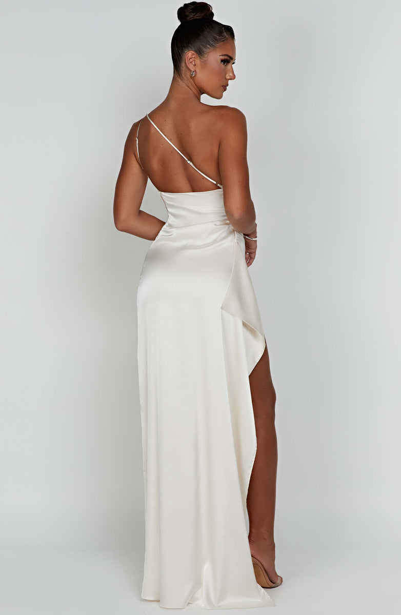 Crafted from a luxurious satin blend, this gown drapes effortlessly, creating a silhouette that commands attention. The one-shoulder neckline with an asymmetric strap and sculpted bodice featuring strategic ruching ensures a flattering fit that enhances your curves.