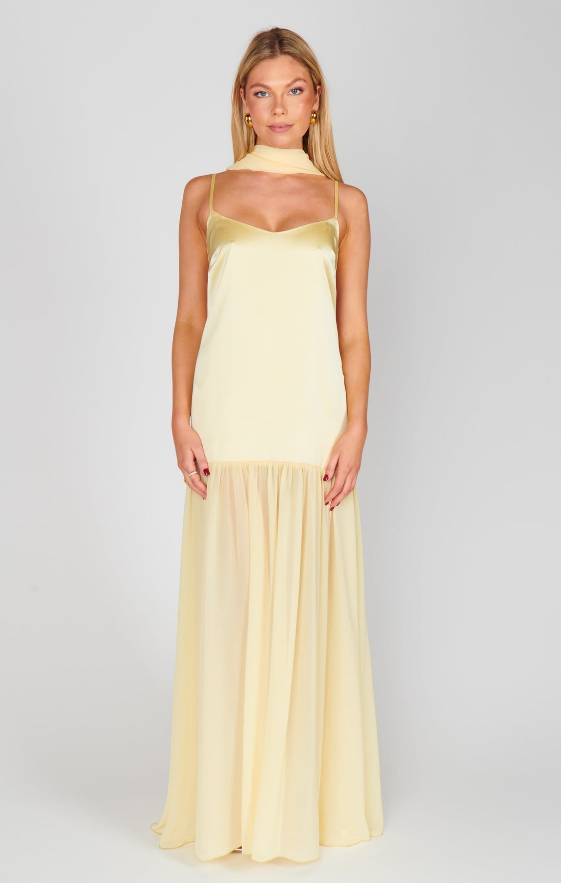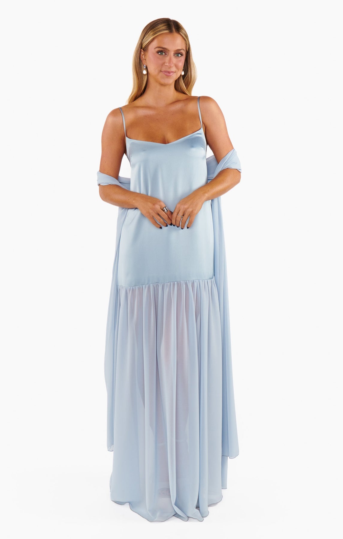 Crafted from lightweight, high-sheen satin, the 'Lavienne' features a slip-style silhouette that gracefully drapes around your figure. Its adjustable straps ensure a perfect fit, while the sheer gathered hem adds a dreamy touch that floats around your ankles.