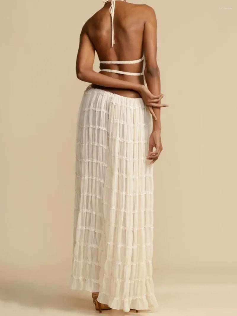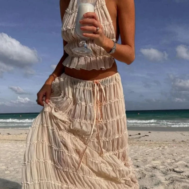 Style it up for an evening affair with heels or keep it casual with sandals. The coordinated top, featuring subtle ruching and a secure elasticized band, ensures a snug fit, whether you're dancing the night away or enjoying brunch with friends.