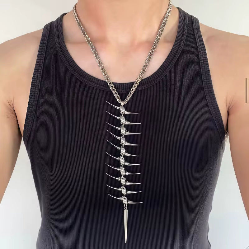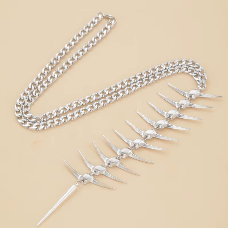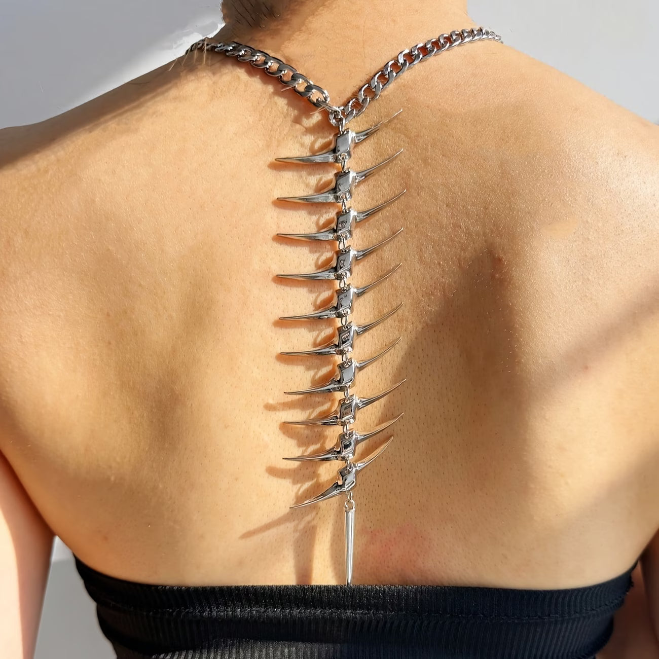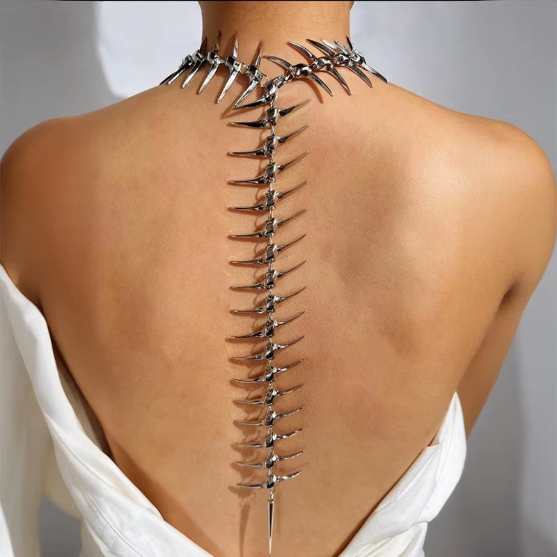 This exquisite sculptural body adornment gracefully embraces the neck and descends along the spinal column, artfully evoking the fluid articulation of Emilia. Meticulously crafted with precisely segmented components and an adaptable chain, it subtly contours the wearer's physique, creating an effect that is both beguiling and mesmerising. Fashioned from brilliant, high-sheen metal, this is a quintessential gothic showpiece guaranteed to command attention—designed to be displayed elegantly down the back, boldly across the décolletage, or as a distinctive choker.
